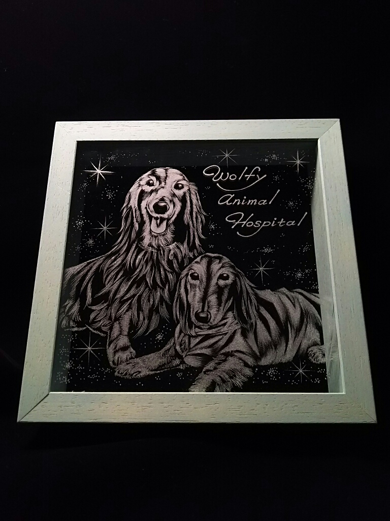 病院のシンボル的な2匹の写真を元に、額装されたガラスに想いを刻み込みました。