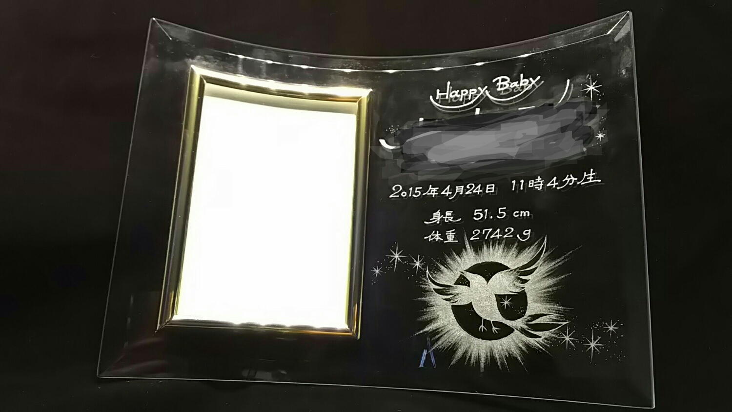 文字入れももちろん世界にひとつですし、さらにご本人専用に想いを込め、(作品写真では個人名はふせてありますが)ご子息のお名前にちなみ「太陽に輝く羽ばたく鳥」のマークをデザインして彫り込みました(^_^)v