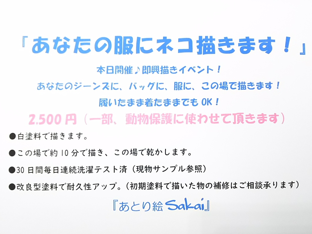 即興描きイベント『あなたの服にネコ描きます!』をまたまた開催いたします!